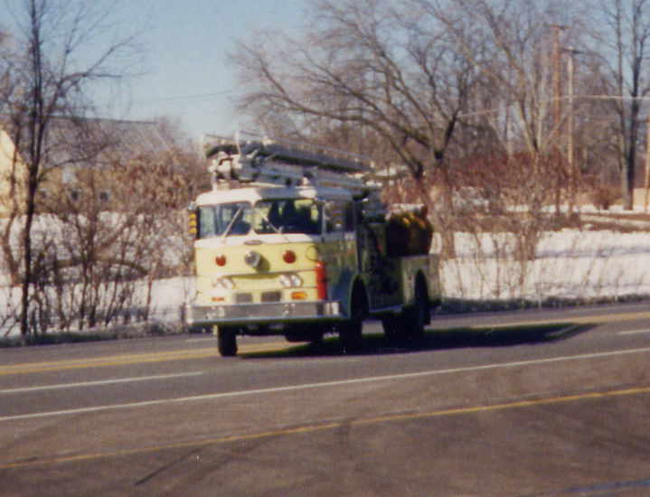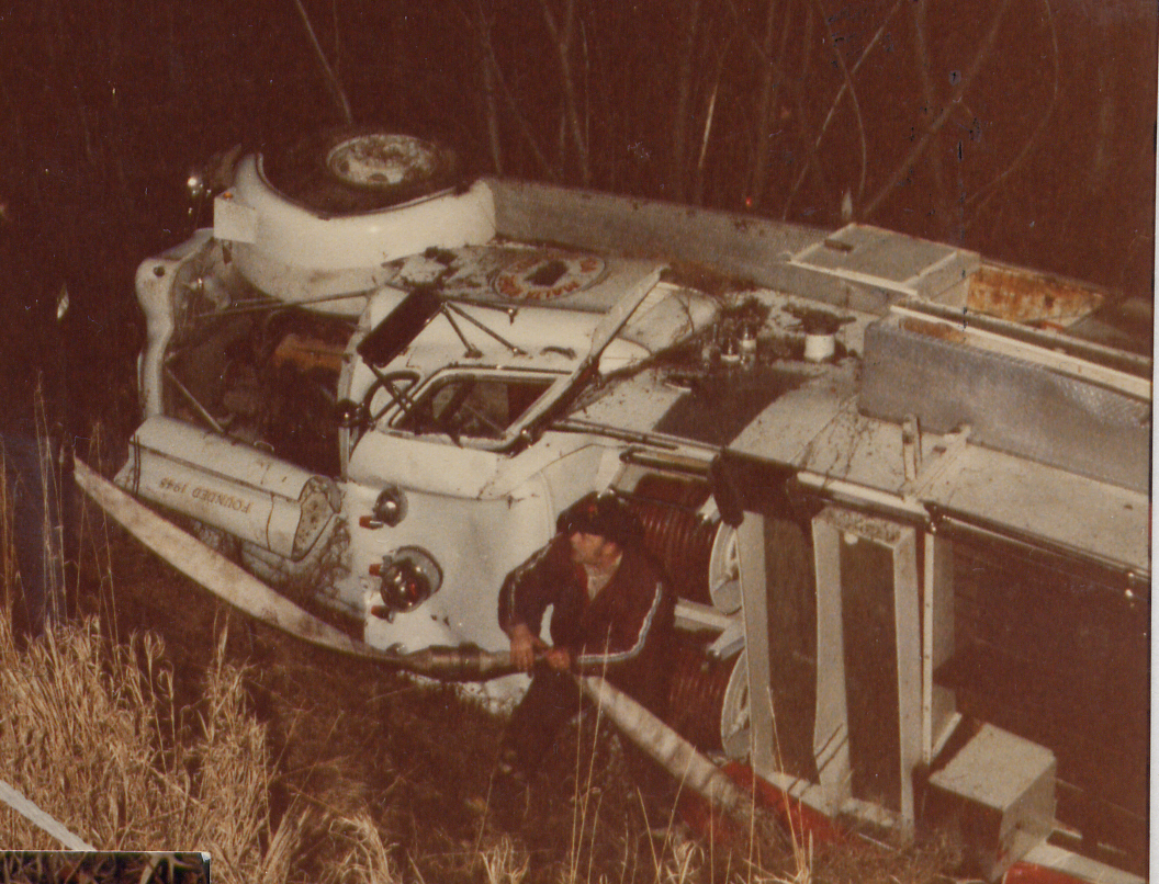 This fire truck was totaled in a roll over accident, across from the Albany- Saratoga Speedway, on route 9, prior to the January 11, 1983 meeting. A newspaper article states it happen on December 29, 1982. Treasurer records indicate January 12, 1983 received from Insurance Company for destroyed pumper $17,950.00 and January 12, 1983 received form insurance company for towing $525.00. The newspaper article also says we are holding a special benefit dinner at Mangino’s Restaurant on Saratoga Lake to raise funds for a new pumper.