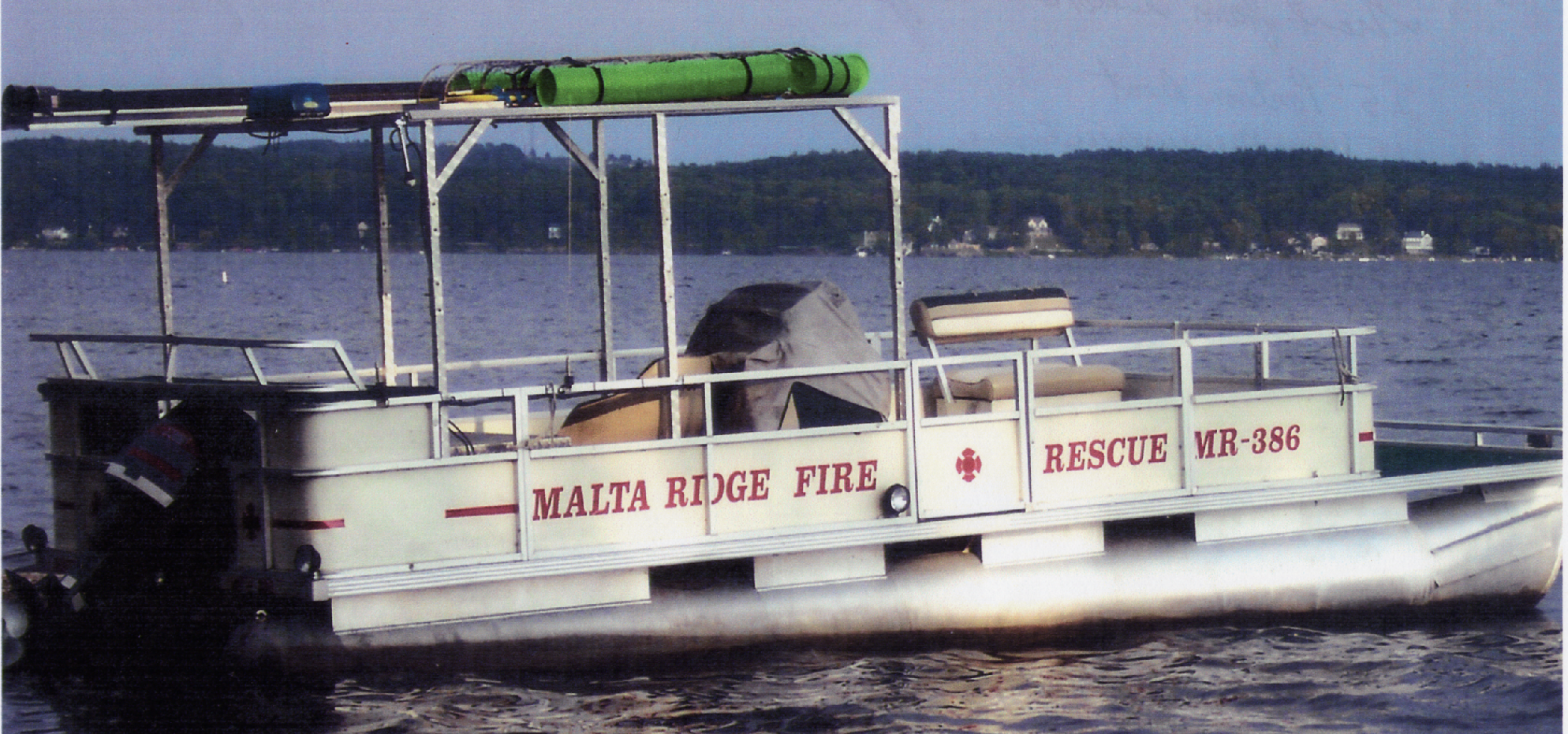 This boat has call number MR-386. The unit was purchase in 1996. It is a 25 foot pontoon fire/rescue boat with 115 horse power Mercursier engine. The boat is docked, in the summer, at charter member Ernest Kunz Riley Cove boat launch. Its purpose is fire and water rescue on Saratoga Lake.