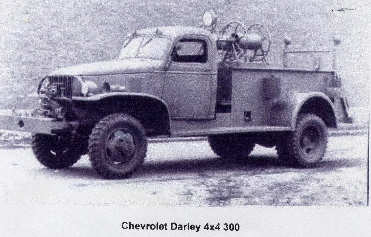 Our 1944 Chevrolet 4 wheel drive, Army surplus, complete and ready to go with American Marsh 500 gpm front end pump, two booster reels, 300 gal. booster tank, hose beds, Indian tank racks, red flashers, etc. Body and tank by Howe, all painted red.
