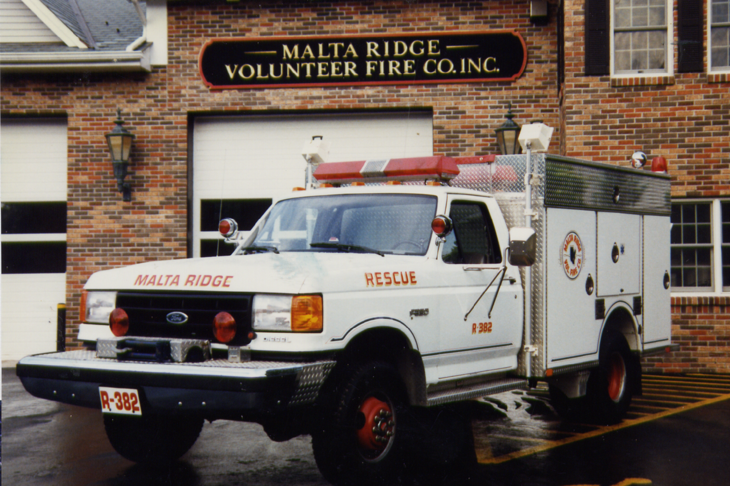 At the December 8, 1987 meeting a motion passed to purchase a new 1988 Ford F350 Rescue vehicle, four wheel drive, diesel engine, automatic transmission, non-walk in storage with generator, task lights, and fifteen Scott air tanks for $39,043,00. Treasurer books indicate payment to Quality Manufacture Company August 4, 1988 $15,587.00 and Nov 2, 1988 $23,456.00 for rescue truck. Because the minutes are missing for 1988 the treasurer records indicates this vehicle was delivered in September or October of 1988. At the February 2, 1997 special meeting it was vote to have this vehicle body converted to a 4 door cab. At the April 9, 2002 meeting a motion was passed to sell the fire rescue truck, R-382 to Newfield rescue squad of Newfield, Maine.