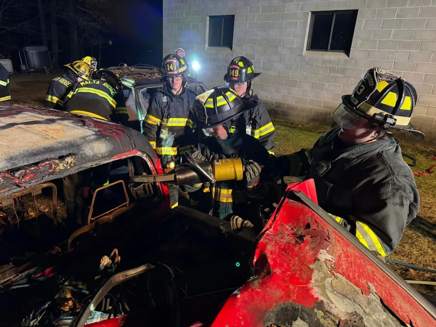 During a Motor Vehicle Accident there a times where the patient requires to be removed from the vehicle (Extrication). MRVFC uses both hydraulic and battery powered extrication tools such as, Cutters and Spreaders (Jaws of Life), Rhino tool, window punches, and Halligan's. Firefighters can Removes your cars door, roof and roll your dash forward towards the front of the vehicle quickly and efficiently so you can be safely removed from the vehicle and be turned over to EMS for treatment. You can see below members of MRVFC on a drill night practicing and teaching newer members how to cut a vehicle apart to rescue someone who is trapped inside a vehicle. Cars used for this drill are donated to the fire company by various scrap yards.